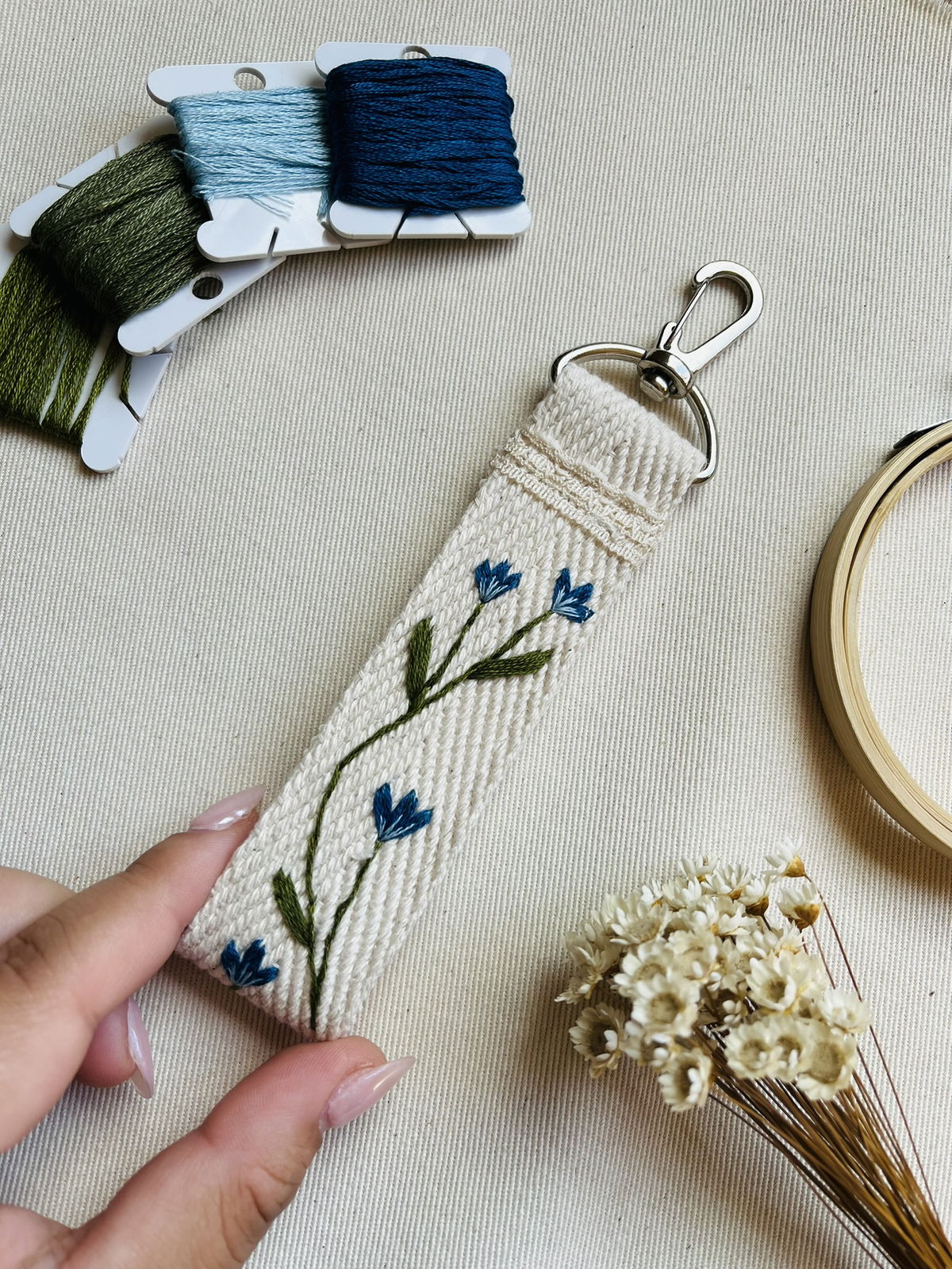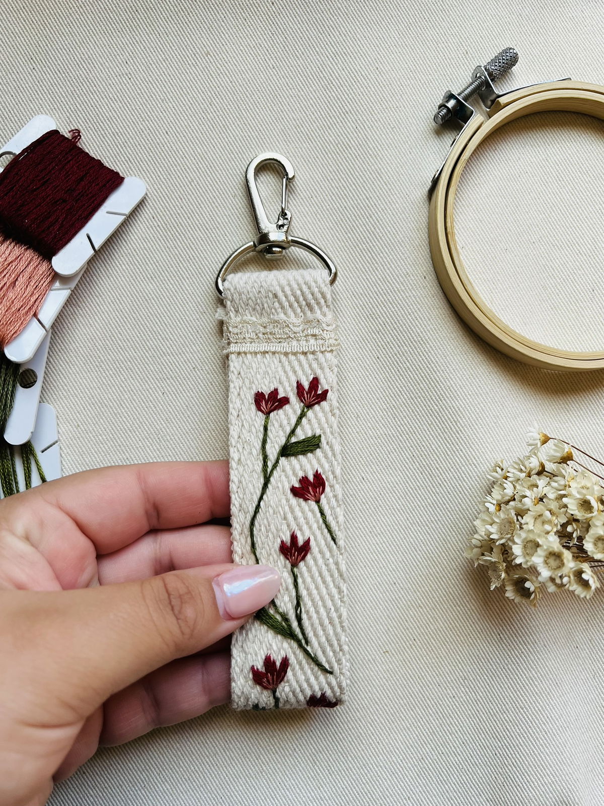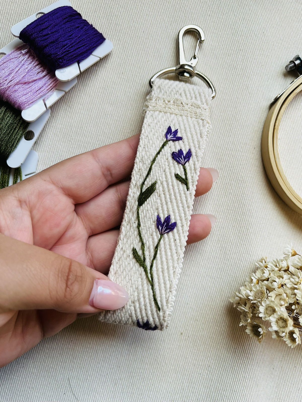 Cada llavero esta bordado en una tira de algodon y decorados con puntillas de algodon y mosqueton PLATEADO o BRONCE