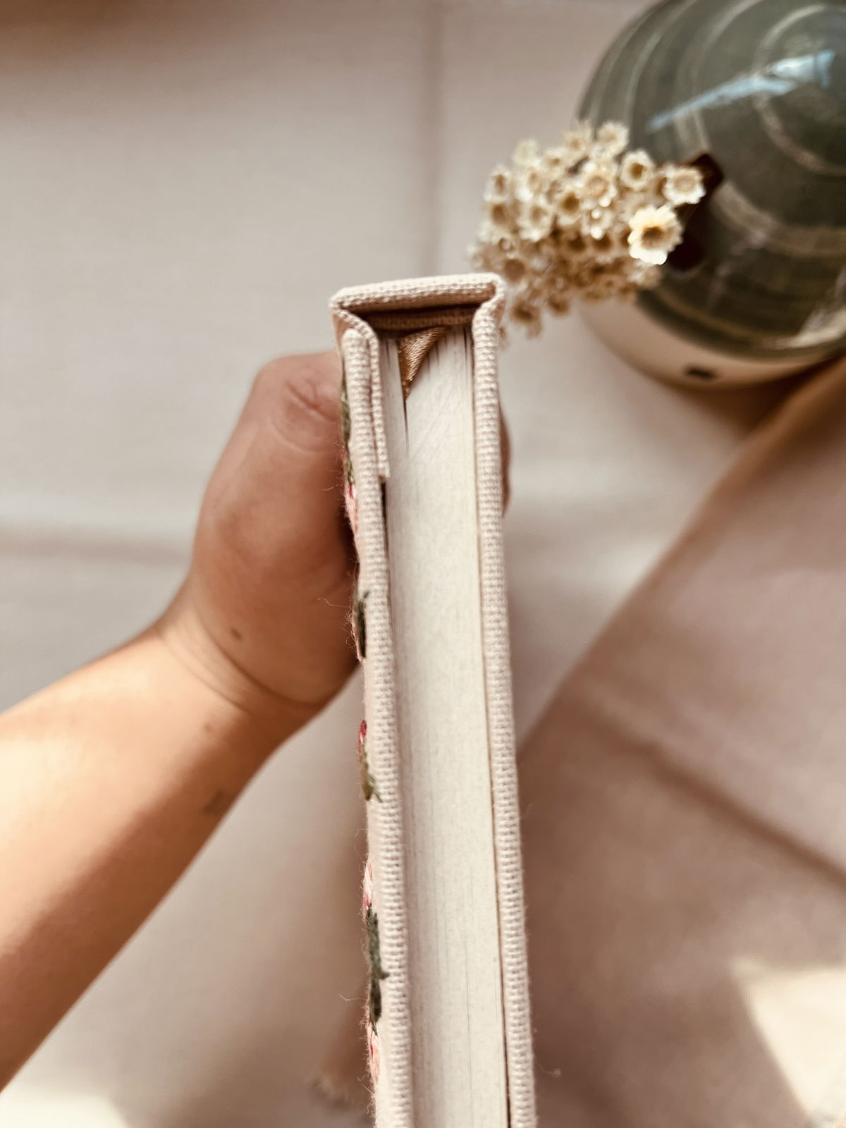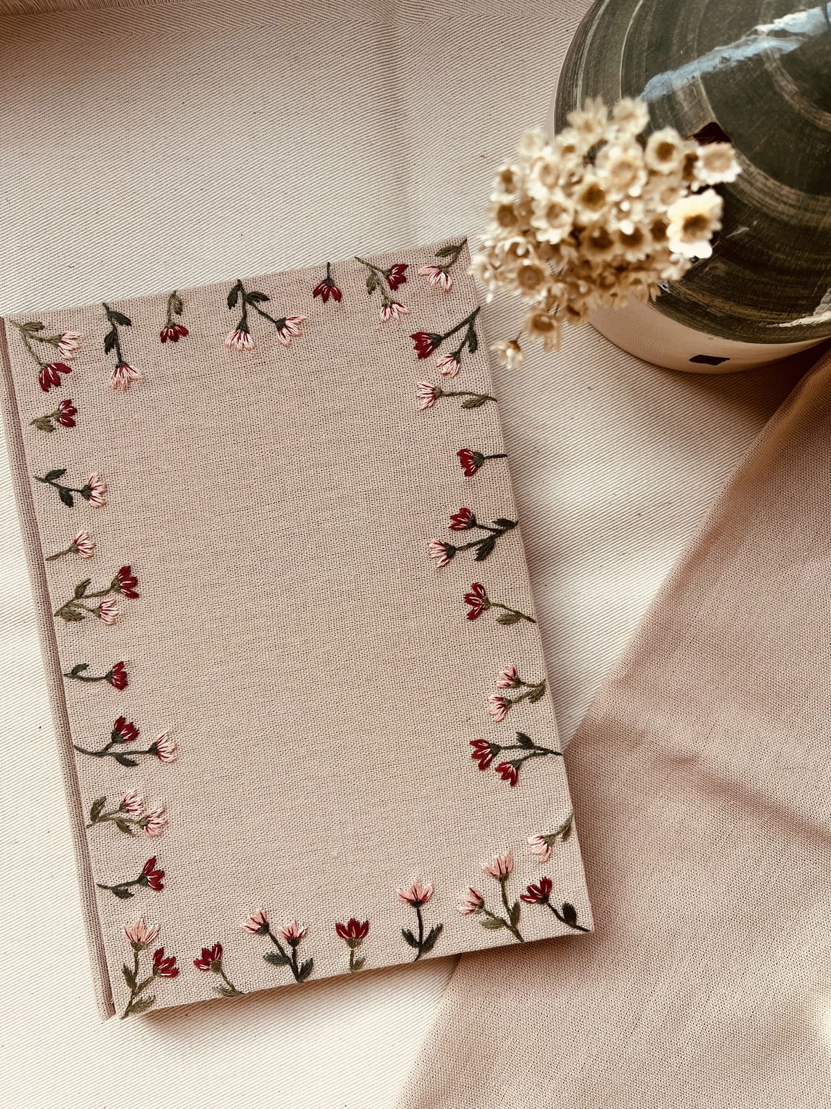 Este cuadernos fue bordado a mano sobre tela, hojas cosidas a mano y encuadernado de manera artesanal.