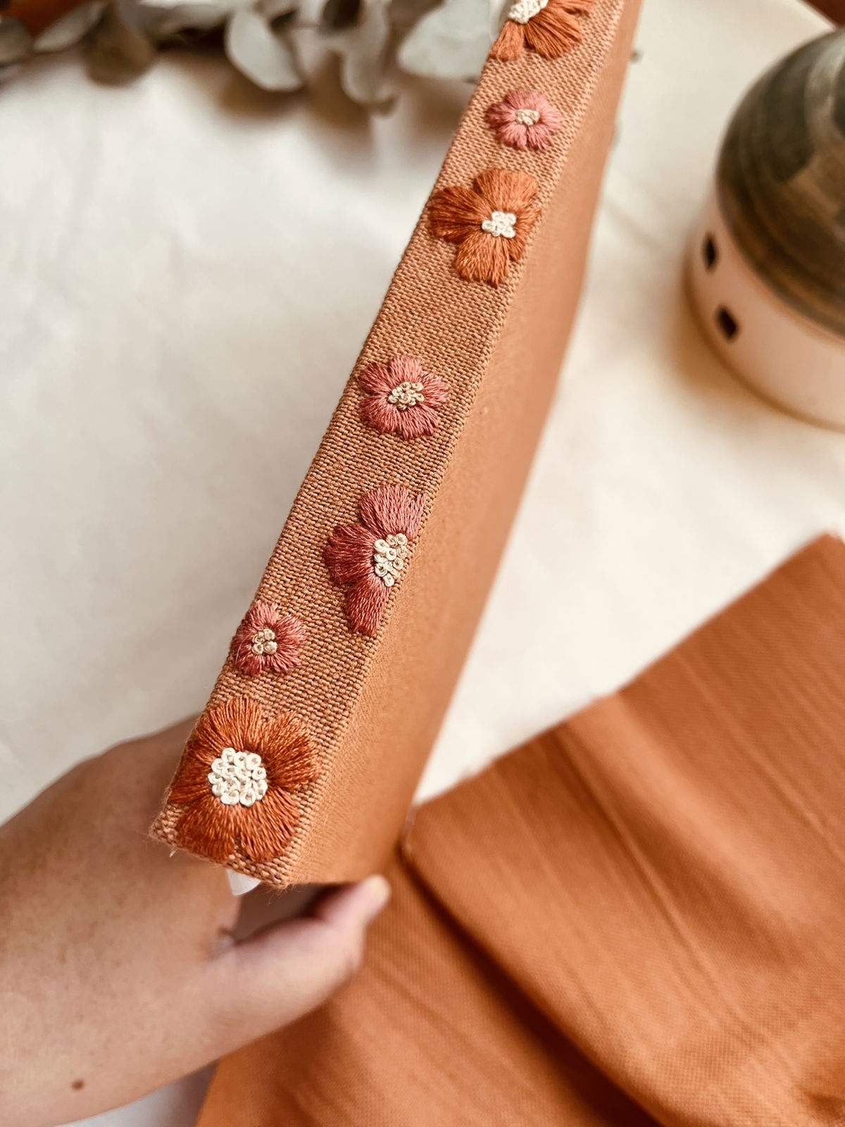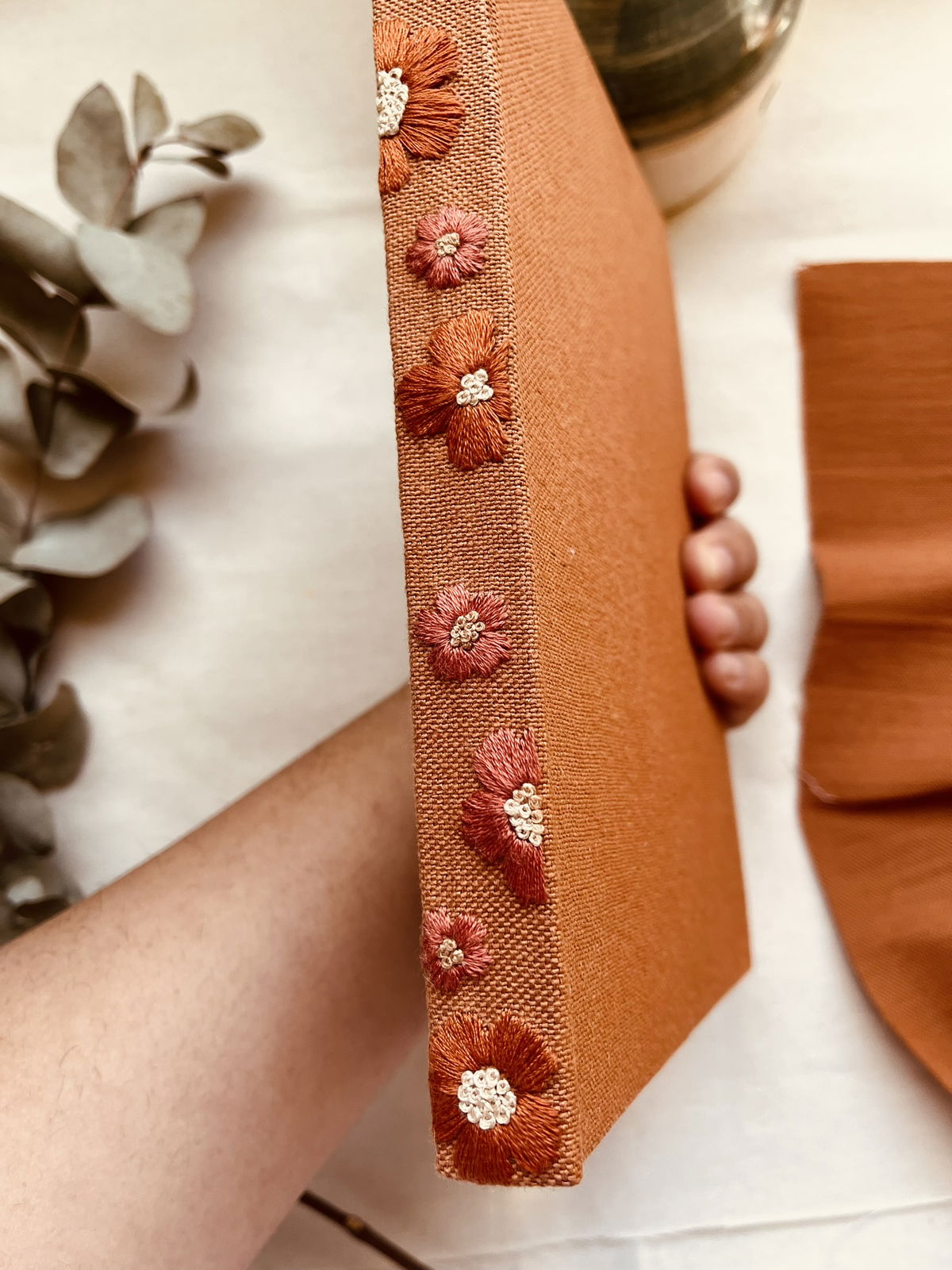 Este cuadernos fue bordado a mano sobre tela, hojas cosidas a mano y encuadernado de manera artesanal.