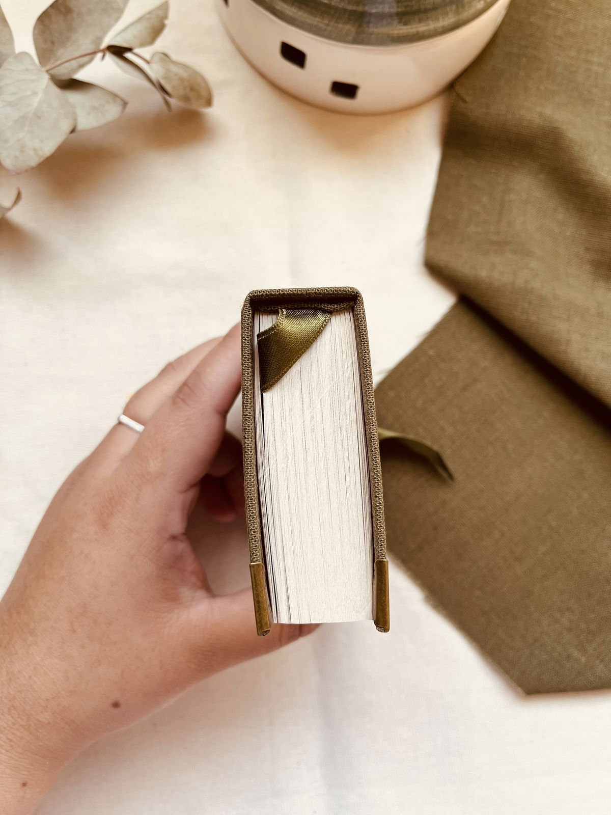 Detalles: esquineros metalicos en color bronce de textura lisa y un señalador ancho color verde musgo