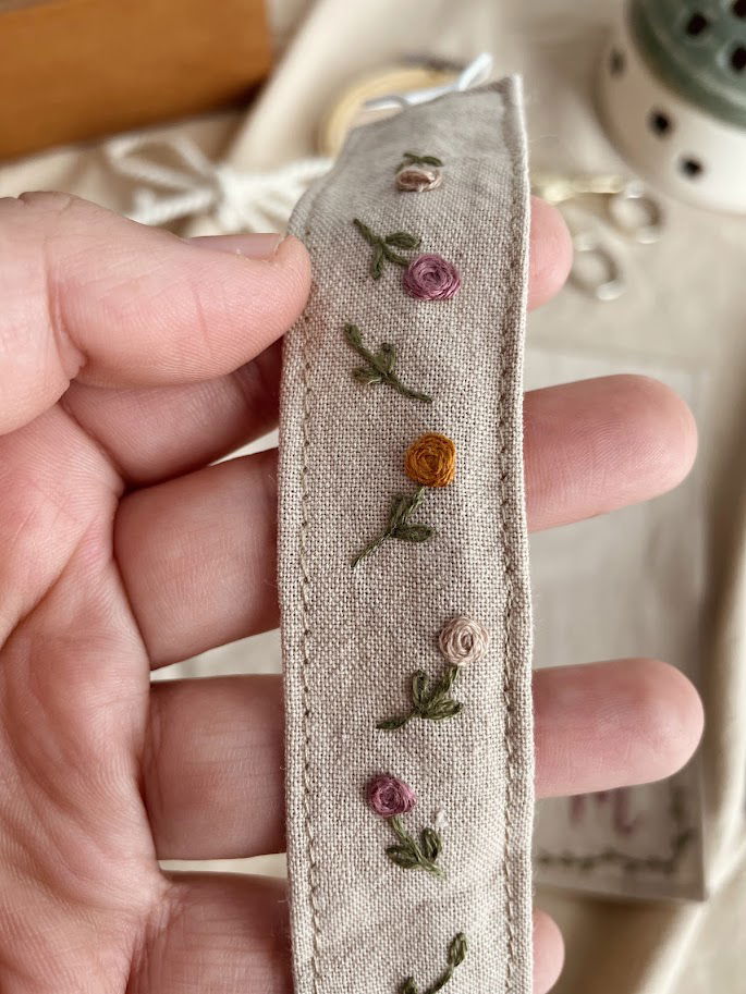 Porta chupete elaborado de manera artesanal, bordado a mano sobre tela