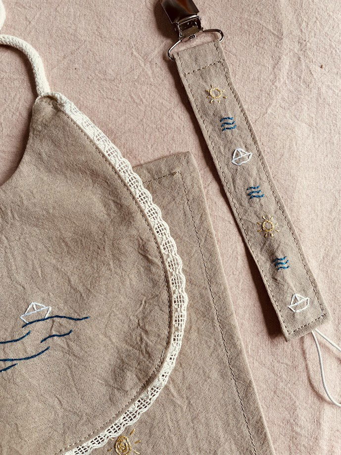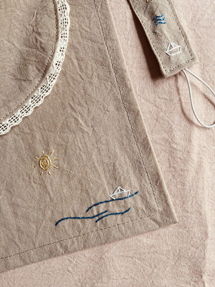 Cada kit es elaborado de manera artesanal, bordado a mano sobre tela, decorado con hilo de algodon trenzado y puntilla de algodon