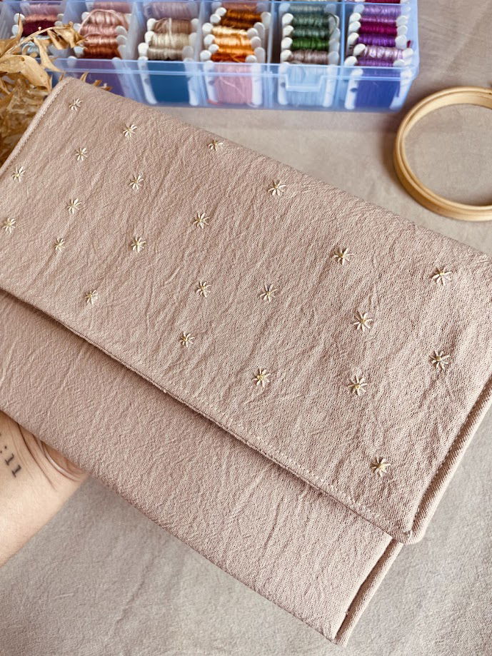Cada sobre es elaborado de manera artesanal; bordado a mano sobre tela, cosido a mano y cuenta con broches imantados con cierre asegurado