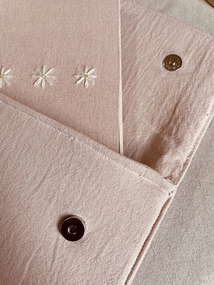 Cada sobre es elaborado de manera artesanal; bordado a mano sobre tela, cosido a mano y cuenta con broches imantados con cierre asegurado