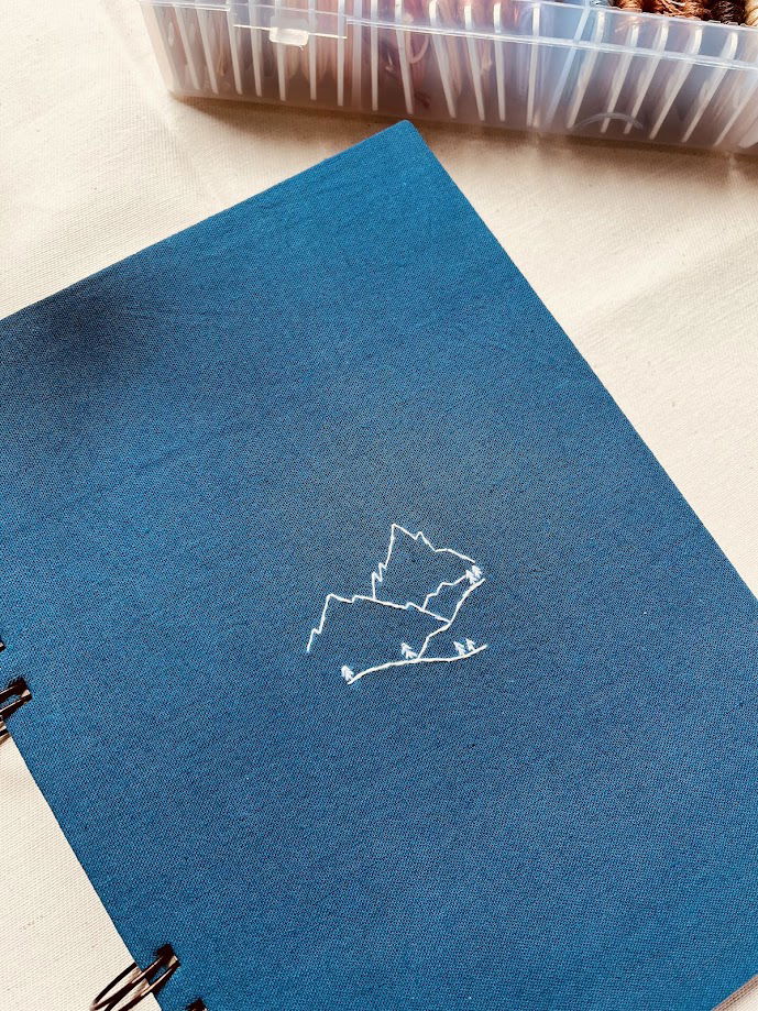 Cada cuaderno esta bordado a mano sobre tela, encuadernado de manera artesanal y luego anillado con un espiral metalico.