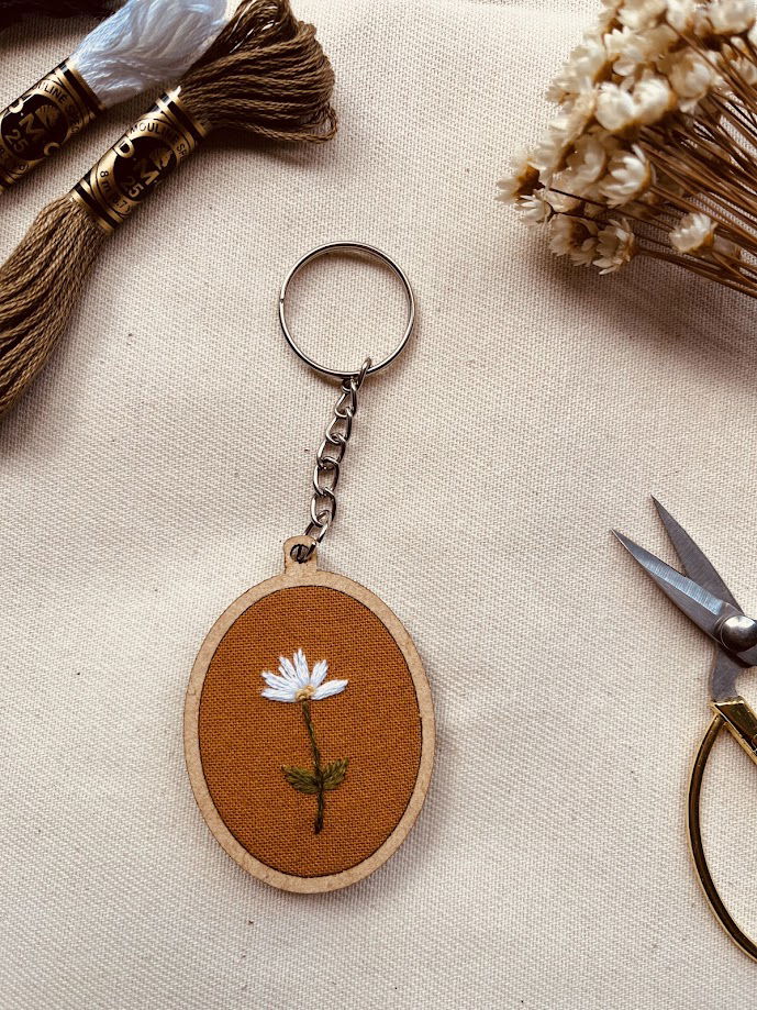 Cada llavero esta bordado sobre tela y enmarcado en un mini-bastidor de MDF