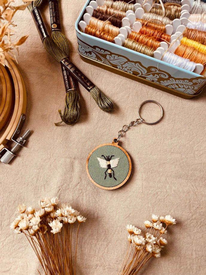 Cada llavero esta bordado sobre tela y enmarcado en un mini-bastidor de MDF