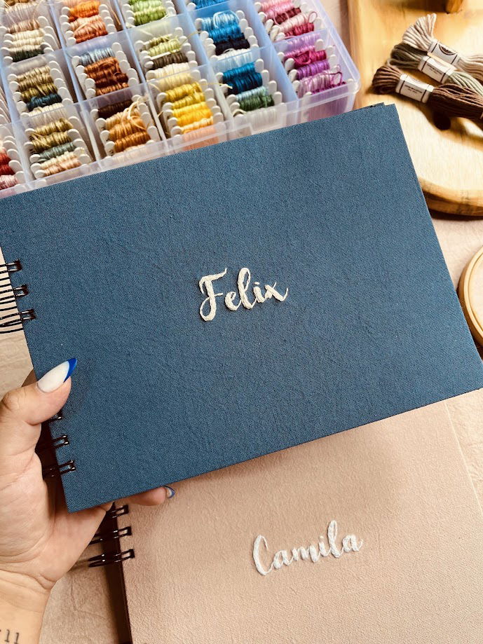 Cada cuaderno esta bordado a mano sobre tela, encuadernado de manera artesanal y luego anillado con un espiral metalico.