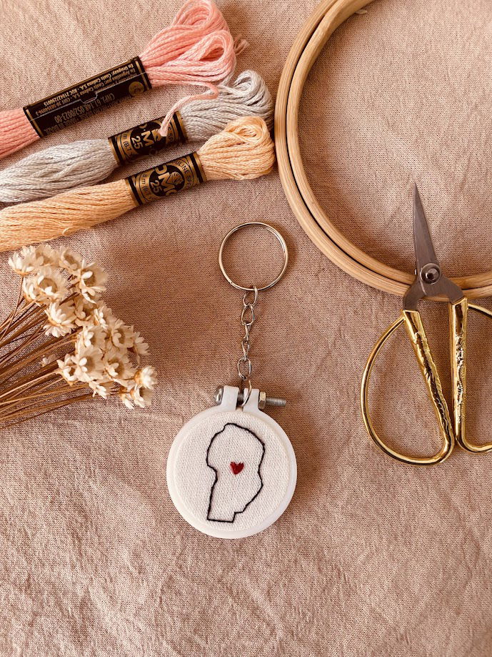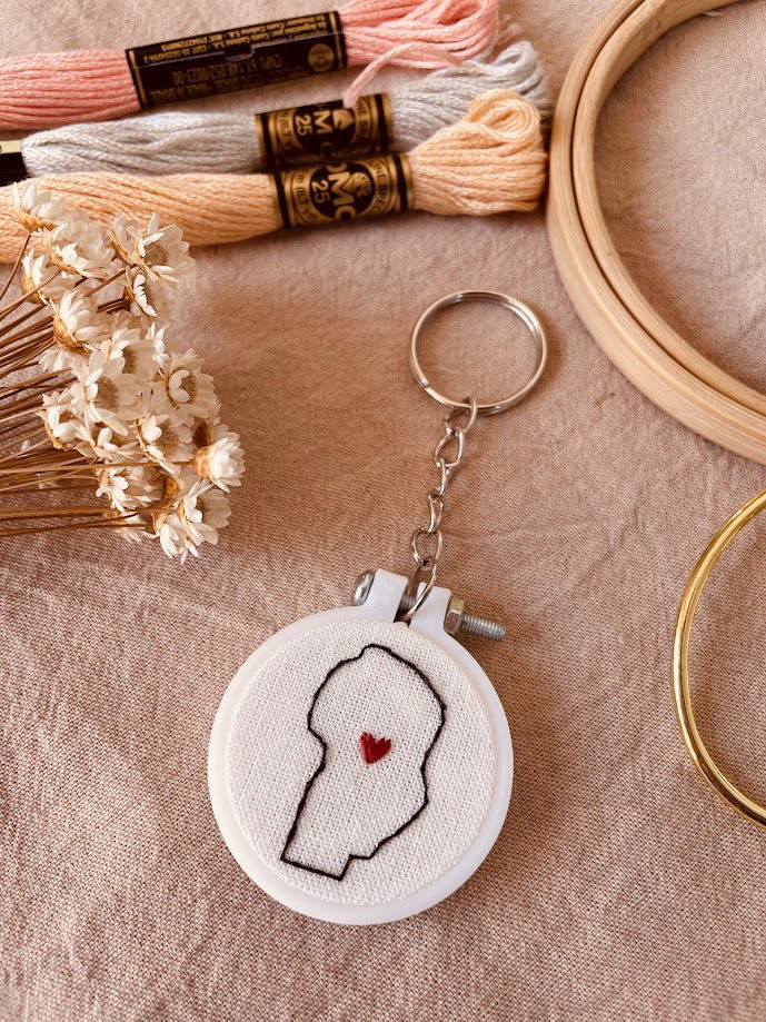 Cada llavero esta bordado en tela y luego enmarcado en un mini bastidor impreso en 3D