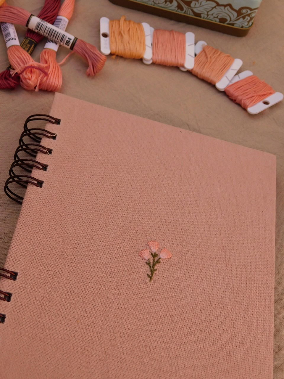 Cada cuaderno esta bordado a mano sobre tela, encuadernado de manera artesanal y luego anillado con un espiral metalico.