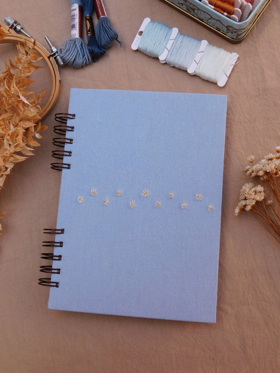 Cada cuaderno esta bordado a mano sobre tela, encuadernado de manera artesanal y luego anillado con un espiral metalico.