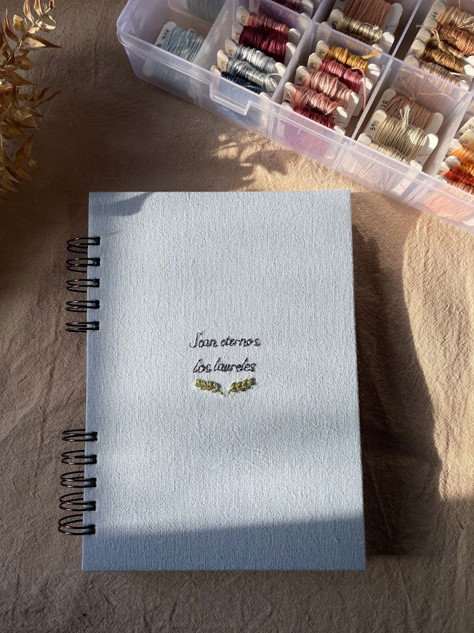 Cada cuaderno esta bordado a mano sobre tela, encuadernado de manera artesanal y luego anillado con un espiral metalico.