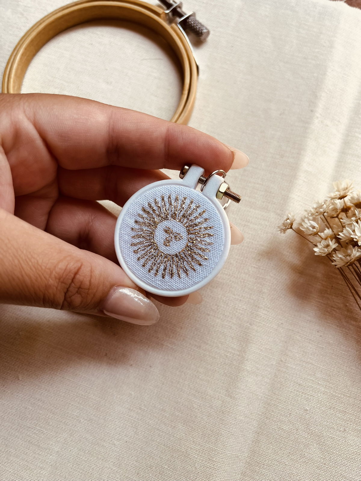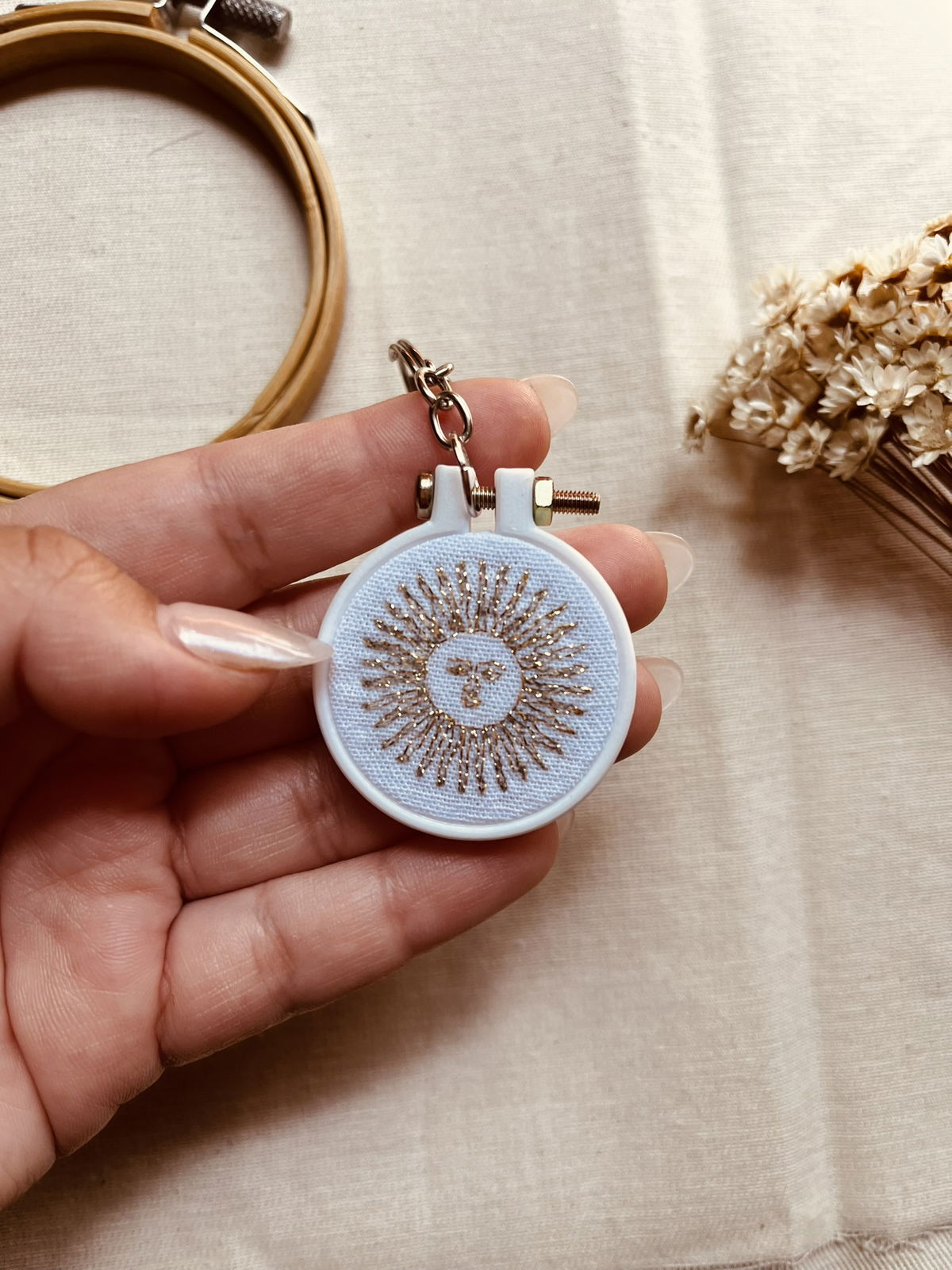Cada llavero esta bordado en tela y luego enmarcado en un mini bastidor impreso en 3D